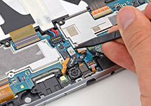 Инженер сервис центра исполняет ремонт: заменяет неисправную деталь новой фирменной деталью